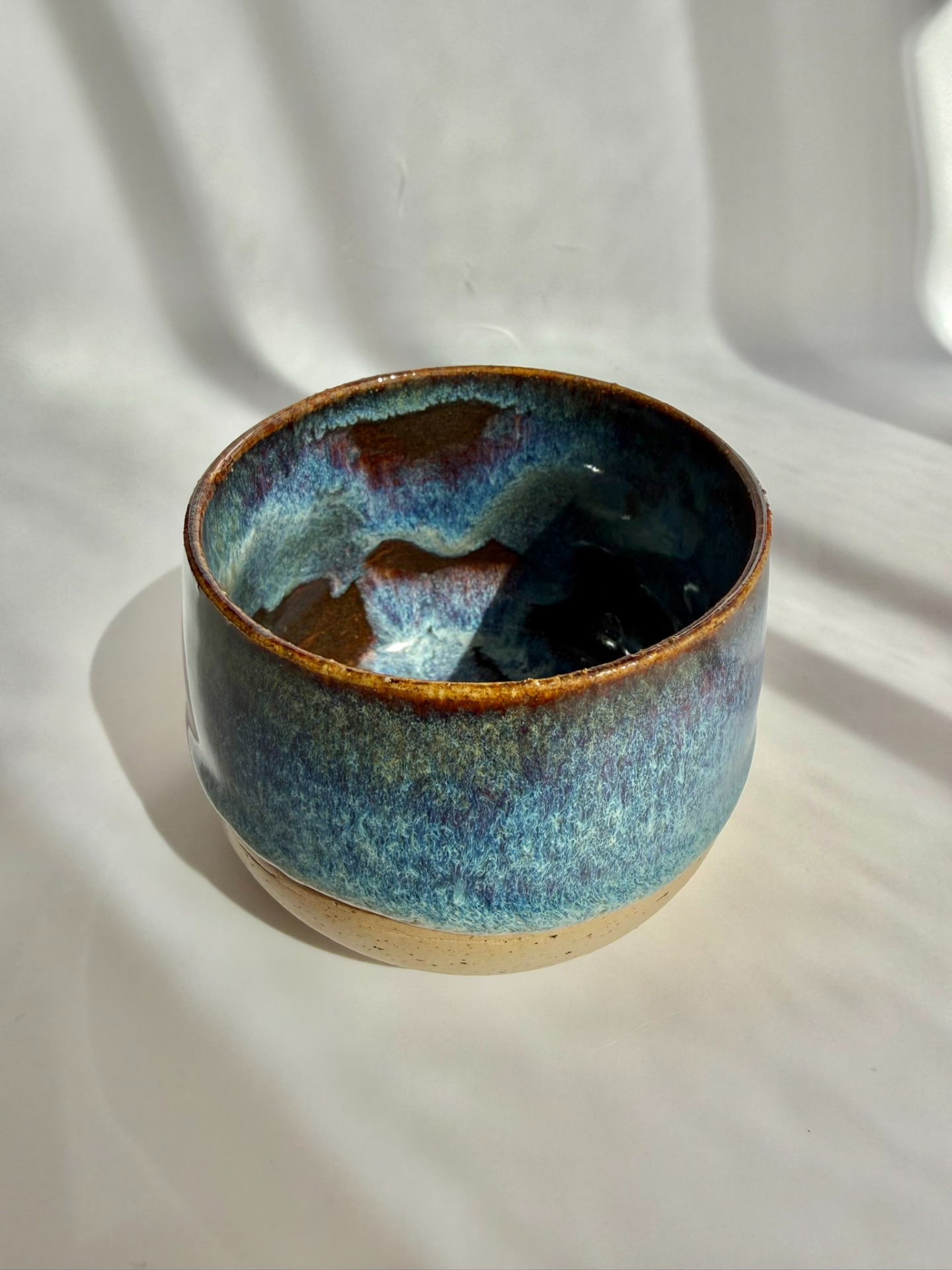 Ručně točený keramický kalíšek s výraznou modrou kresbou glazury.