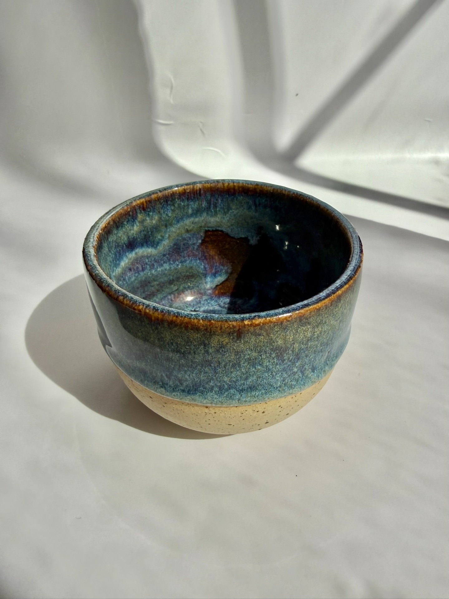 Ručně točený keramický kalíšek s výraznou modrou kresbou glazury.