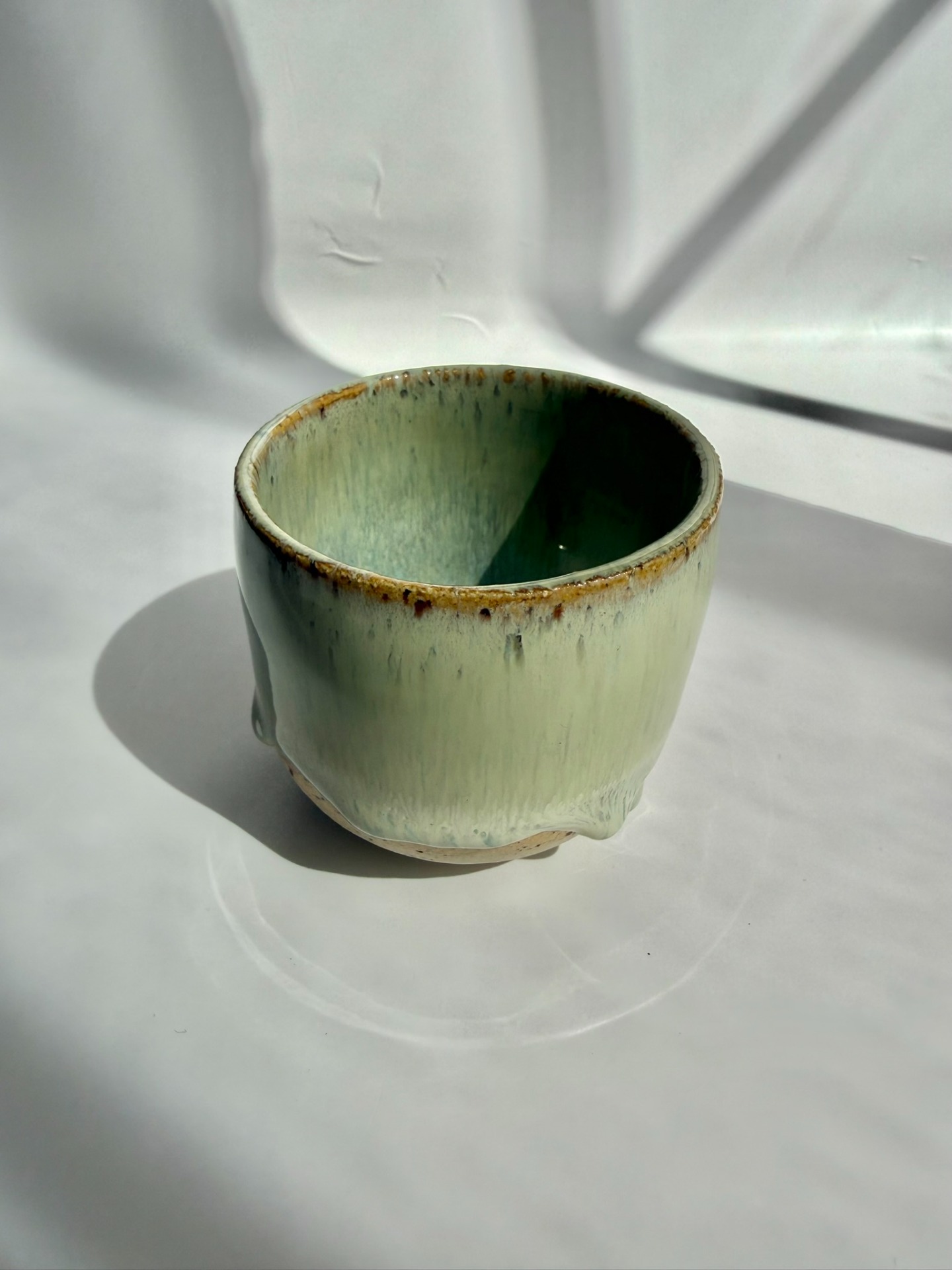 Ručně točený keramický kalíšek s jemnou zelenou kresbou glazury.