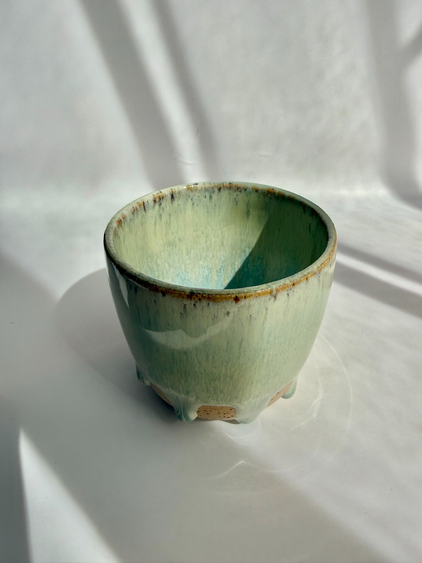 Ručně točený keramický kalíšek s jemnou světle zelenou kresbou glazury.