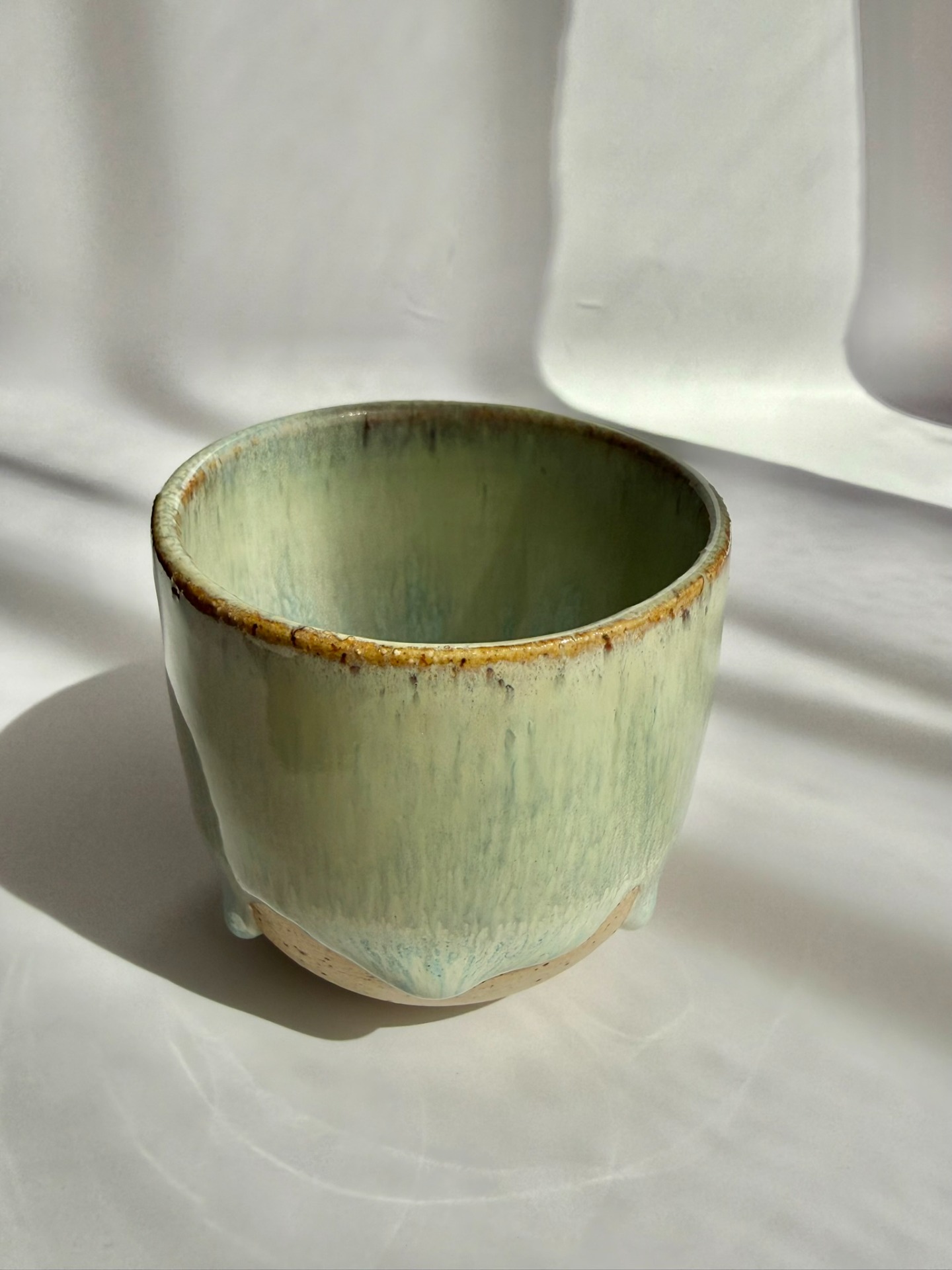 Ručně točený keramický kalíšek s jemnou, přírodní kresbou glazury.