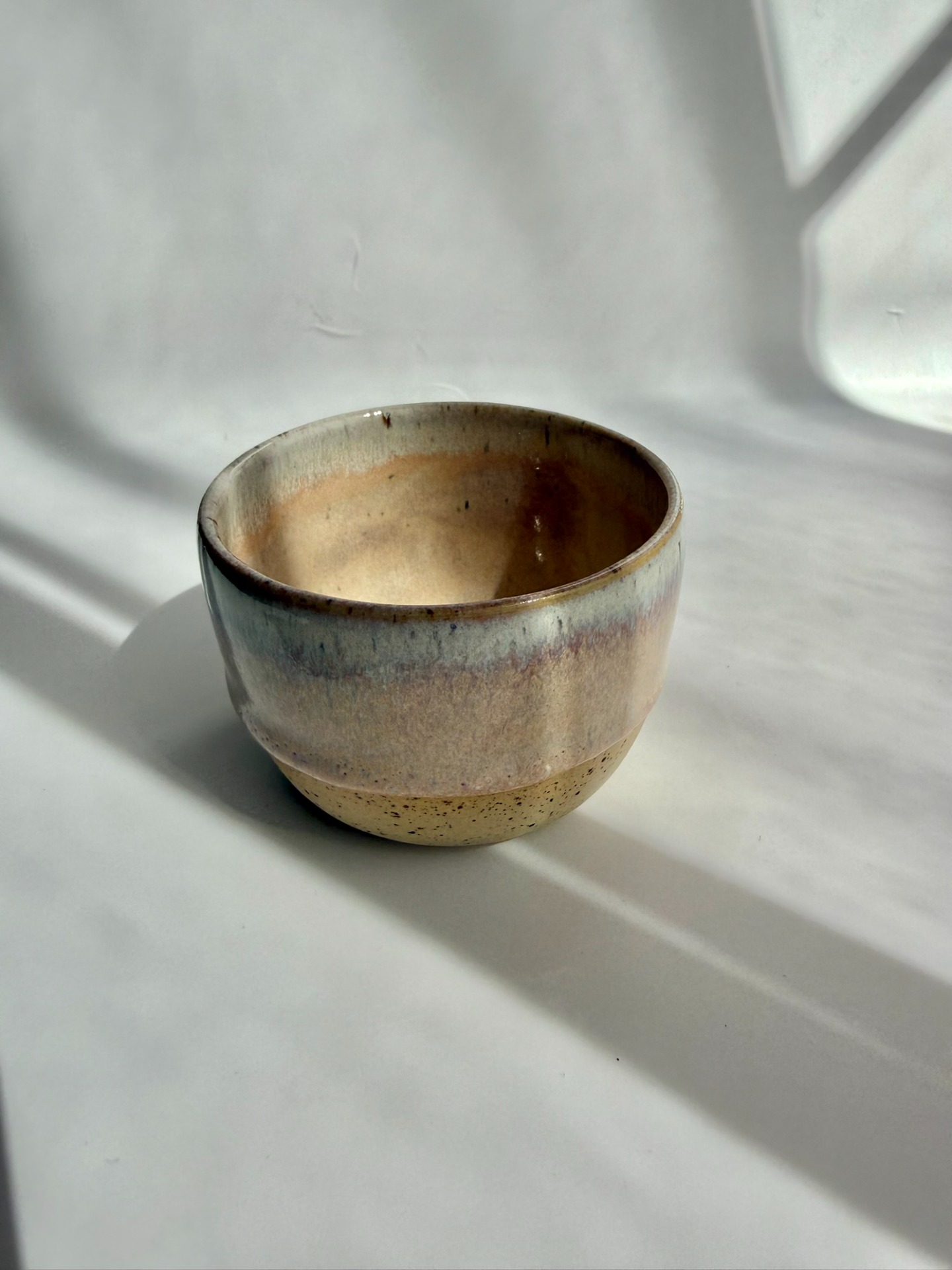 Ručně točený keramický kalíšek s jemnou krémovo-růžovou kresbou glazury.