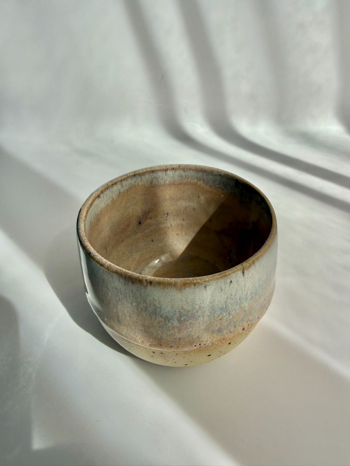 Ručně točený keramický kalíšek s jemnou krémovo-růžovou kresbou glazury.