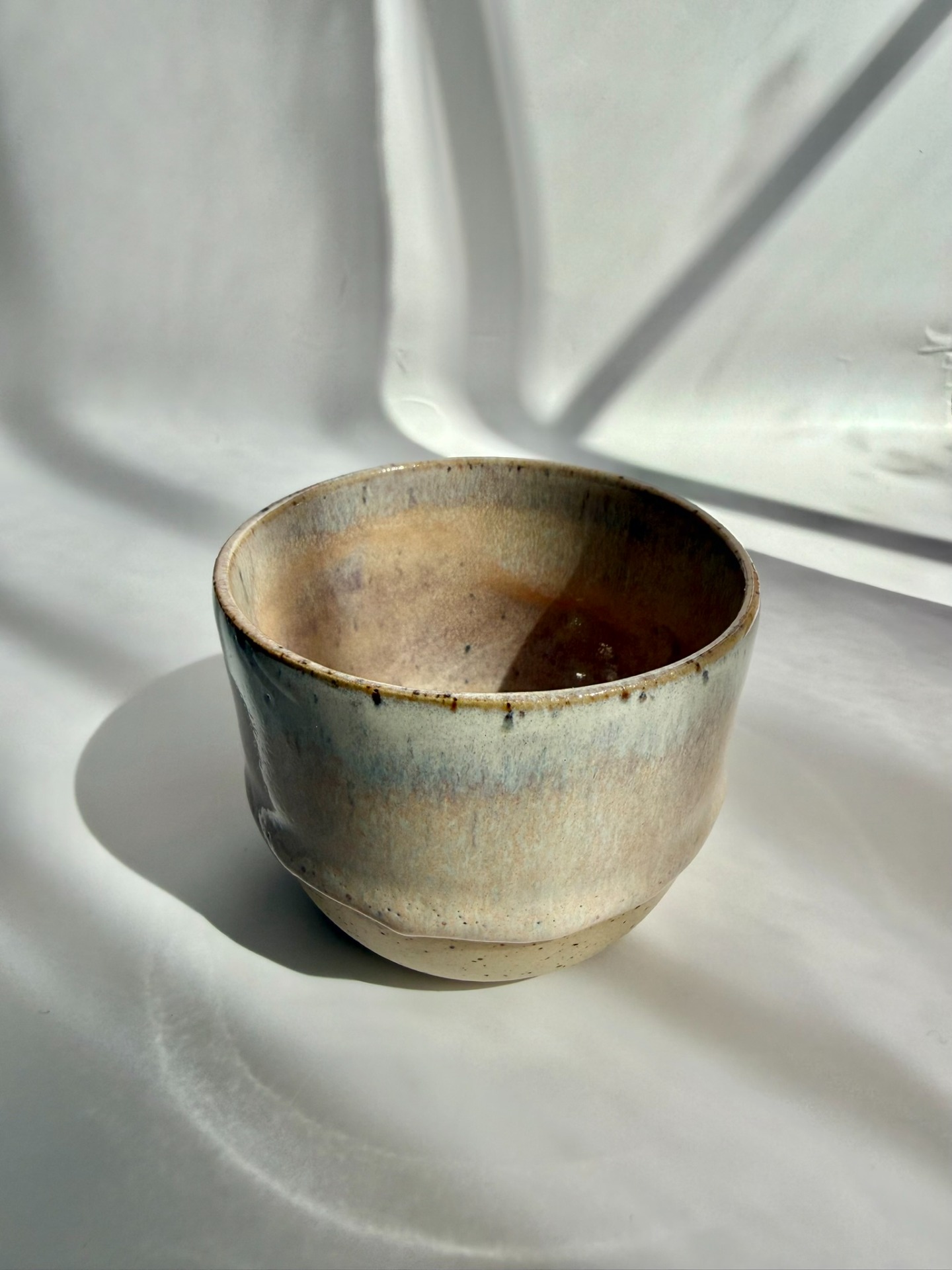 Ručně točený keramický kalíšek s jemnou krémovo-růžovou kresbou glazury.