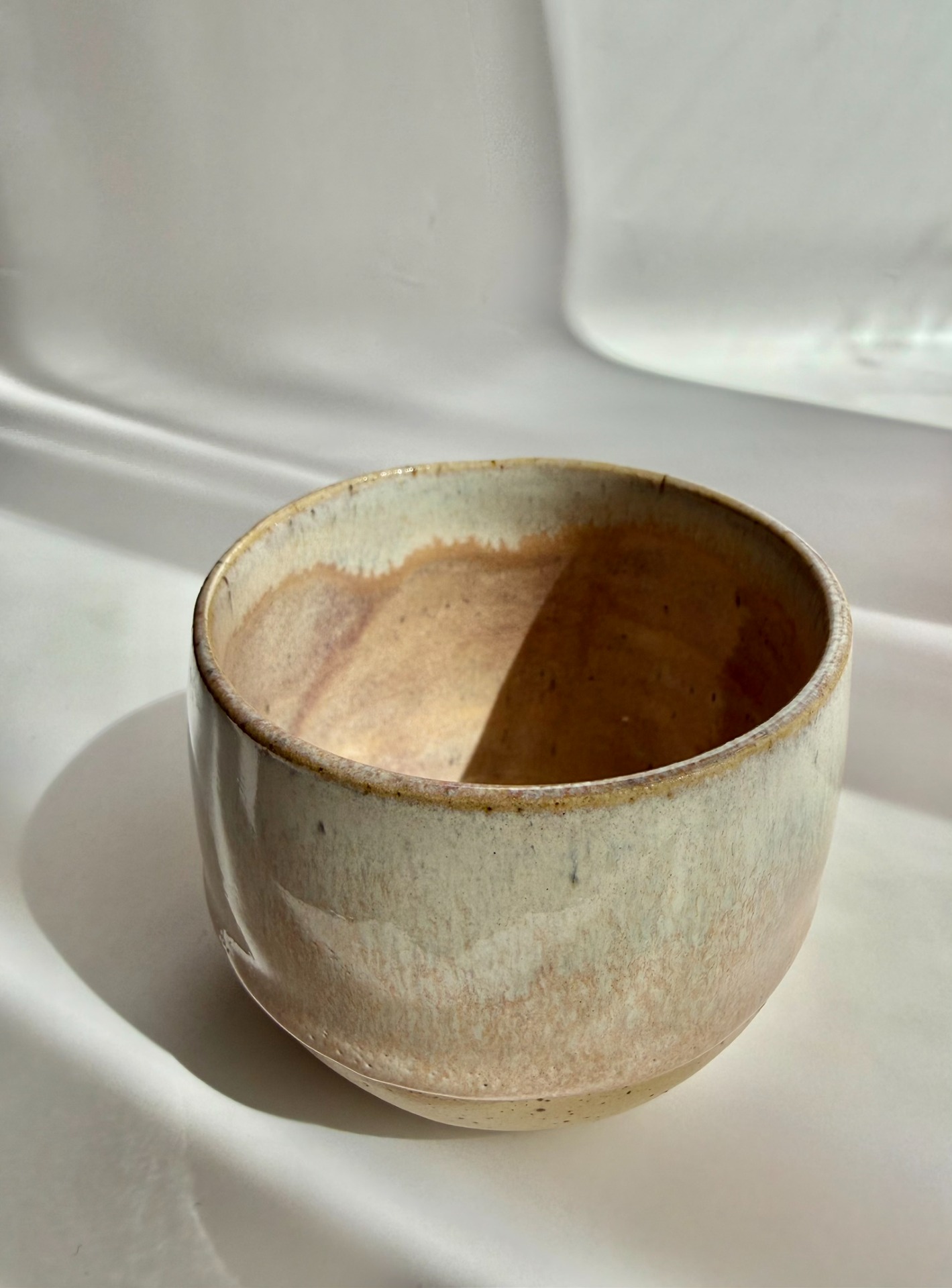 Ručně točený keramický kalíšek s jemnou, přírodní kresbou glazury.