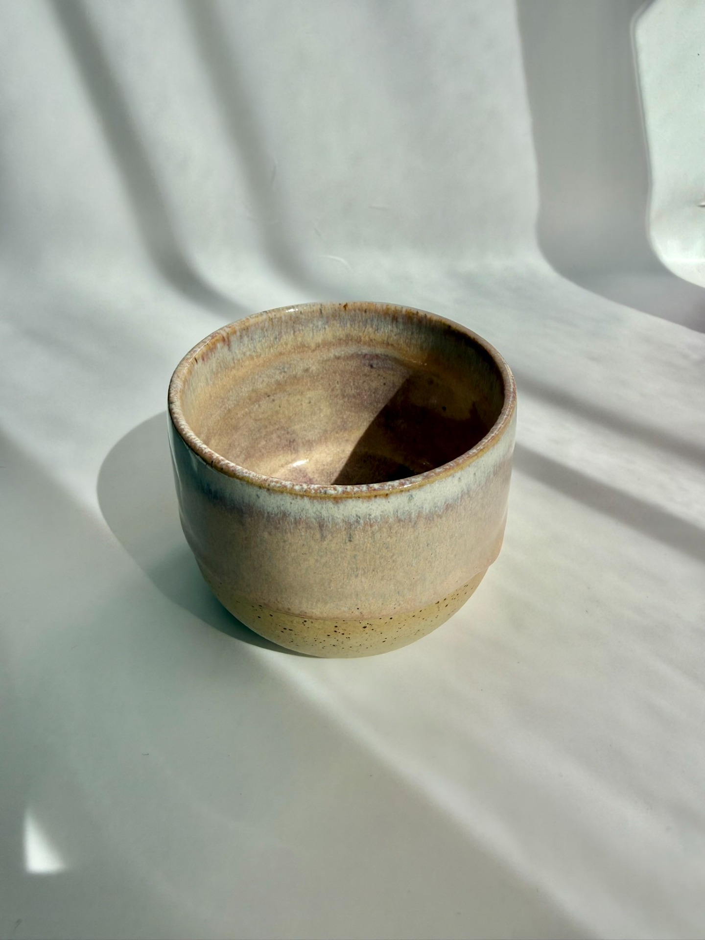 Ručně točený keramický kalíšek s jemnou, přírodní kresbou glazury.