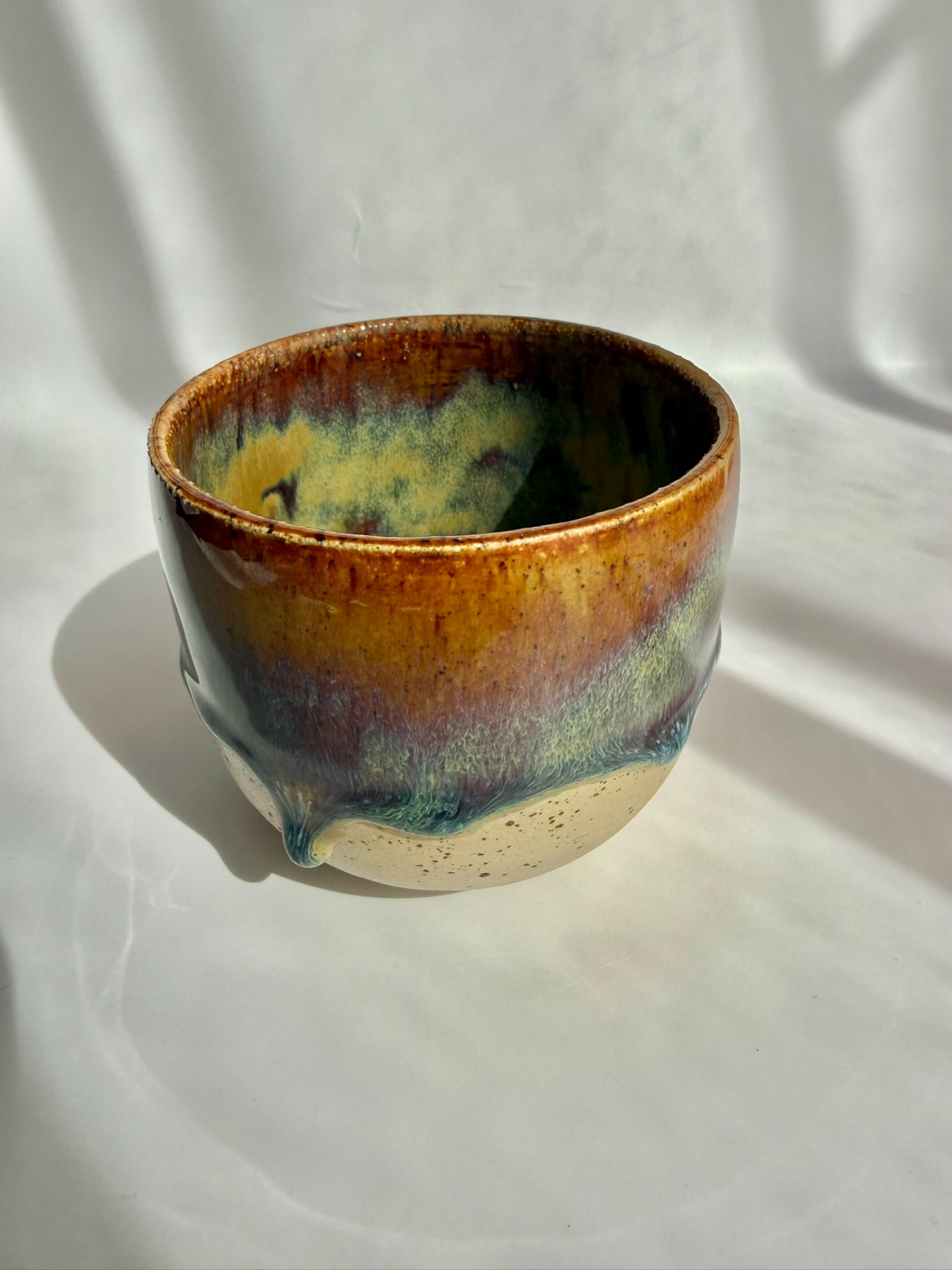 Ručně točený keramický kalíšek s výraznou kresbou glazury v teplých tónech.