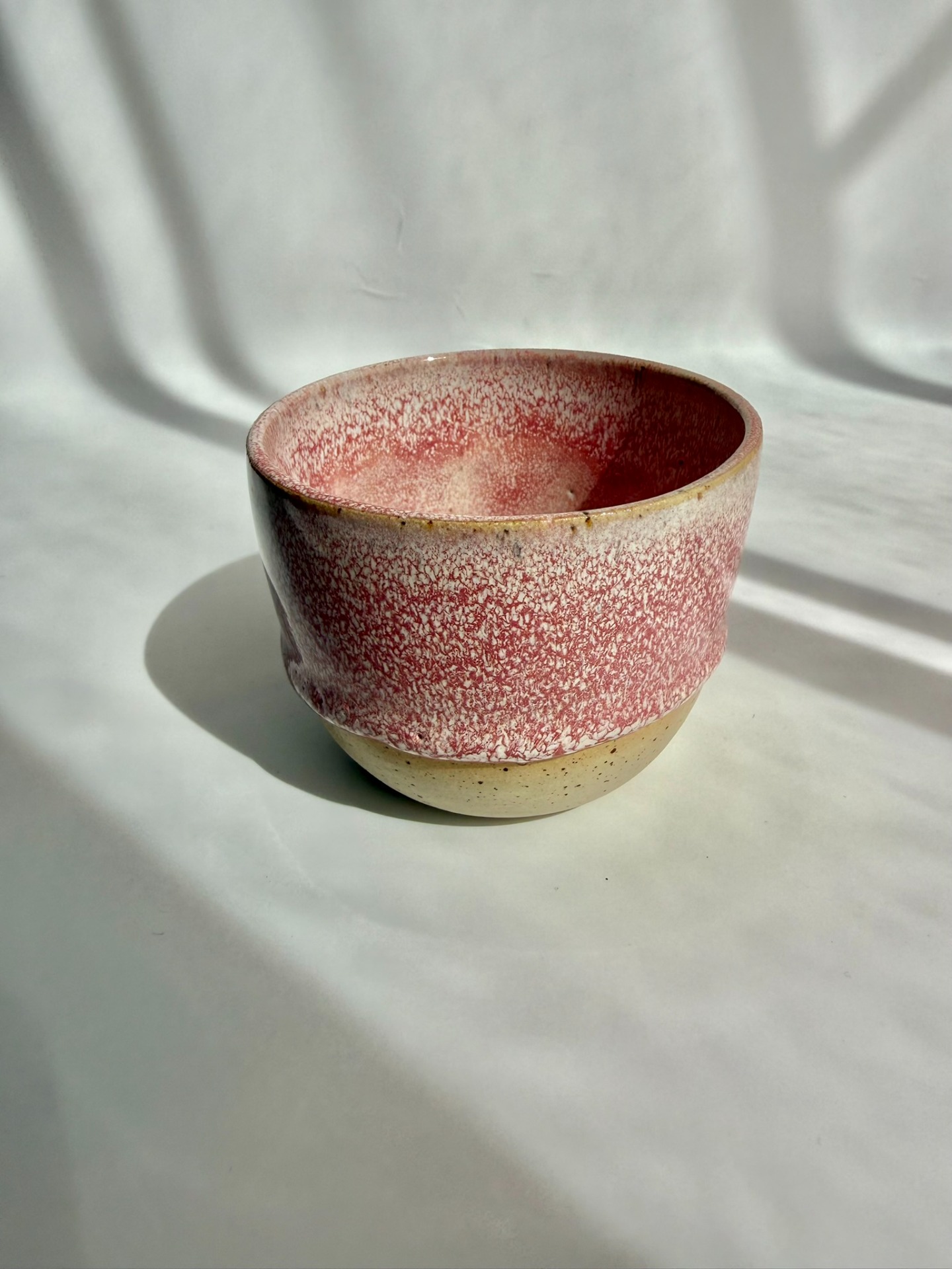 Ručně točený keramický kalíšek s jemnou růžovou kresbou glazury.