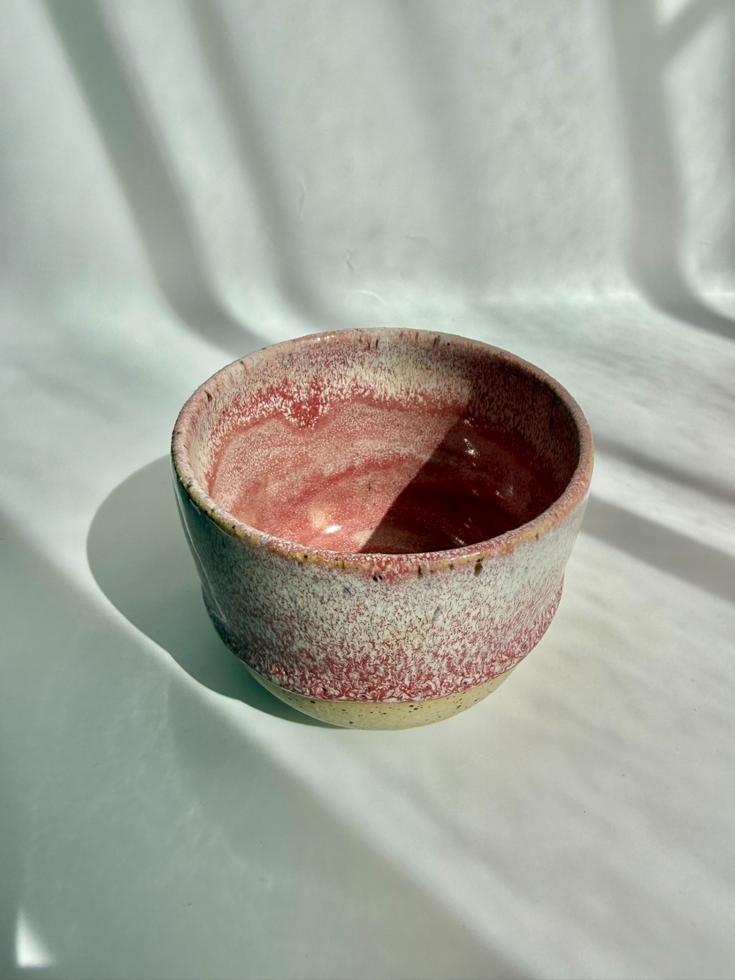Ručně točený keramický kalíšek s jemnou růžovou kresbou glazury.