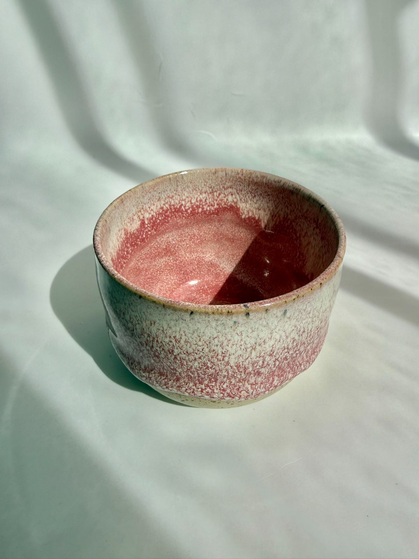 Ručně točený keramický kalíšek s jemnou růžovou kresbou glazury.