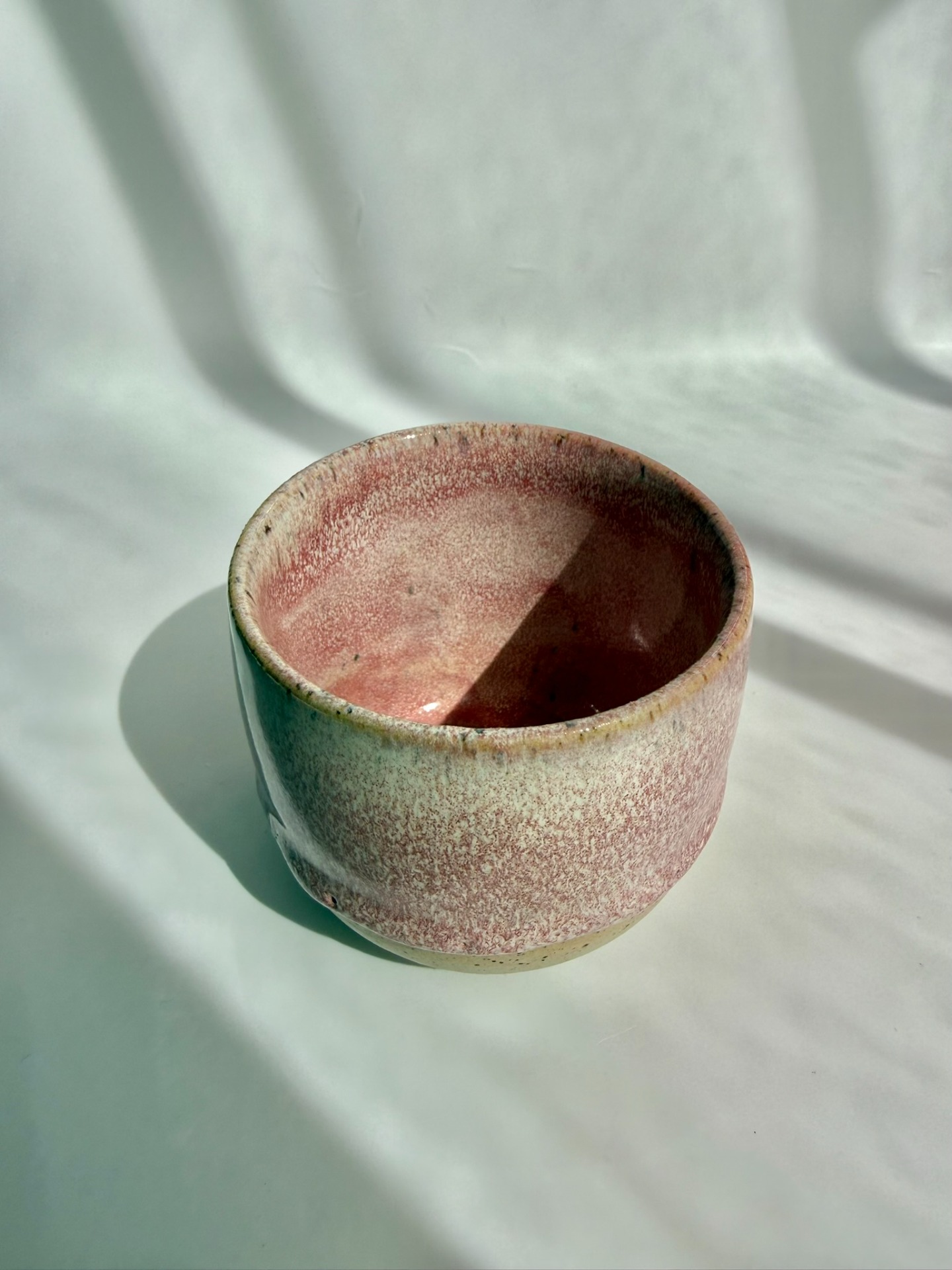 Ručně točený keramický kalíšek s jemnou růžovou kresbou glazury.